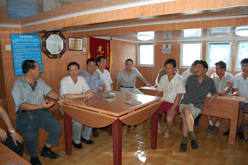 張書記(左二)與第七工程處皖吸五號(hào)船長親切交談