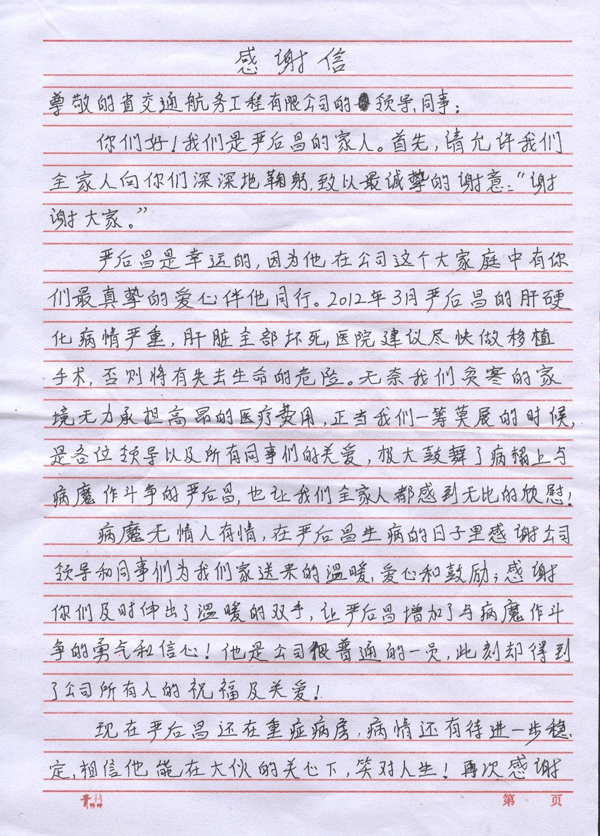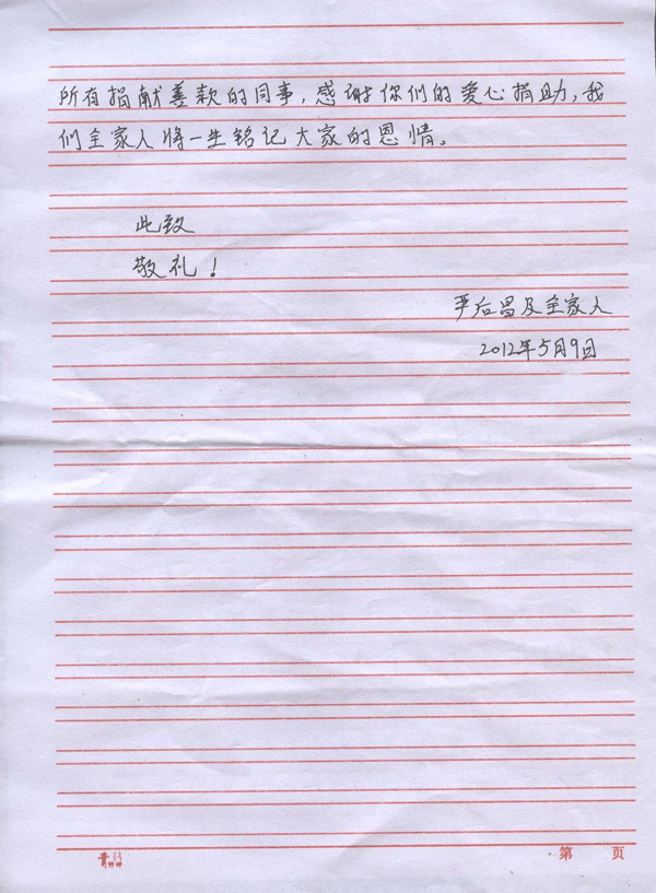 倡議發(fā)出后公司領(lǐng)導(dǎo)帶頭捐款,機(jī)關(guān)、項(xiàng)目部、工程處職工踴躍捐款,共收到捐款13660元。5月15日下午,公司工會(huì)主席王永來代表全體職工把捐款交到嚴(yán)后昌同志女兒手中,體現(xiàn)了公司職工對(duì)嚴(yán)后昌同志因病造成家庭困難的關(guān)心和關(guān)愛,幫助他戰(zhàn)勝疾病,渡過難關(guān),愿我們的點(diǎn)滴付出匯成愛心的暖流,讓暗淡的生命重新迸發(fā)出燦爛的霞光,我們祝愿嚴(yán)后昌同志早日康復(fù)!