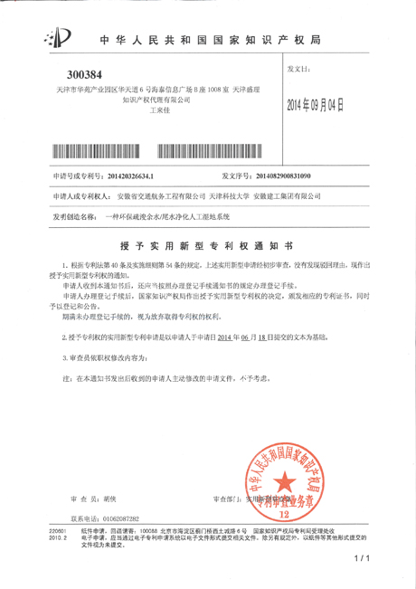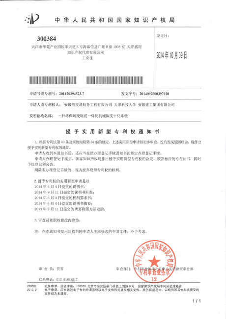 近日,國家知識產(chǎn)權(quán)總局專利管理司傳來喜訊,我公司獲得兩項(xiàng)實(shí)用新型專利授權(quán),《一種環(huán)保疏浚底泥一體化機(jī)械深度干化系統(tǒng)》,專利號:201420294523.7,《一種環(huán)保疏浚余水/尾水凈化人工濕地系統(tǒng)》,專利號:201420326634.1,這是公司重視“科技興企”戰(zhàn)略的重要成果,實(shí)現(xiàn)了公司在專利申請方面零的突破,同時(shí)為提高公司技術(shù)能力和深入實(shí)施“科教興企”戰(zhàn)略打下了堅(jiān)實(shí)的基礎(chǔ)。