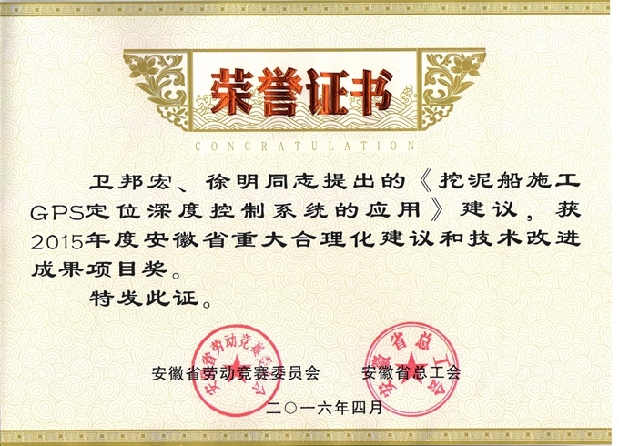 近日,從安徽省勞動(dòng)競(jìng)賽委員會(huì)、安徽省總工會(huì)傳來(lái)喜訊,安徽交航疏浚工程分公司提出的《挖泥船施工GPS定位深度控制系統(tǒng)的應(yīng)用》建議,榮獲2015年度安徽省重大合理化建議和技術(shù)改進(jìn)成果項(xiàng)目獎(jiǎng)。