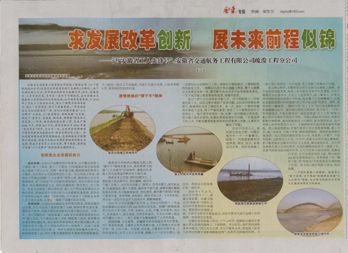 5月20日,安徽工人日報第2版“風(fēng)采”專版大幅刊登了題為《求發(fā)展改革創(chuàng)新,展未來前程似錦》——榮獲 “安徽省工人先鋒號”的安徽交航疏浚工程分公司先進(jìn)事跡。