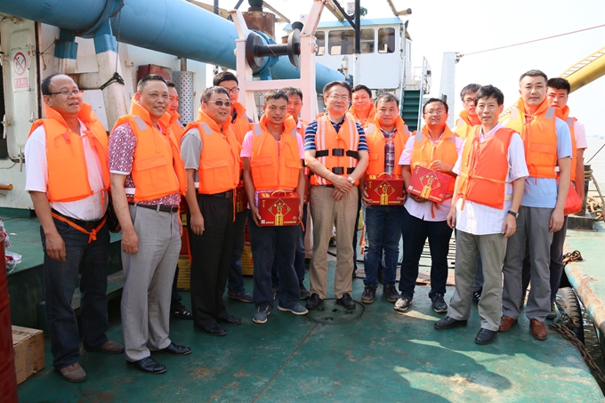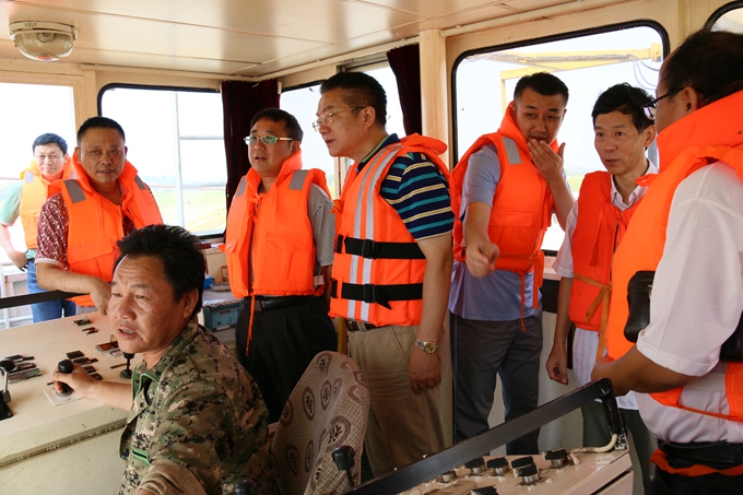 在交通艇上,劉總認真聽取了安徽交航青弋江疏浚項目的詳細介紹,了解了施工進度和下一步施工計劃。登船后與船員們一一握手、親切交談,詢問他們生活飲食情況、防暑降溫措施,隨后登上船舶操作室,詳細了解挖泥船施工技術(shù),通過GPS定位觀察位于水下的施工作業(yè)面積。劉總囑咐船員們在船上作業(yè)要注意安全,在酷暑天氣保障生產(chǎn)進度的同時切實做好防暑降溫工作,確保健康防暑、平安防暑。