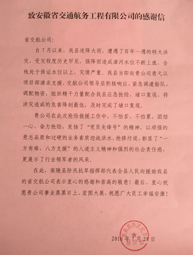 7月28日,安徽交航收到一份來(lái)自南陵縣防汛抗旱指揮部的感謝信,感謝我公司在此次搶險(xiǎn)救災(zāi)過(guò)程中做出的巨大貢獻(xiàn)。