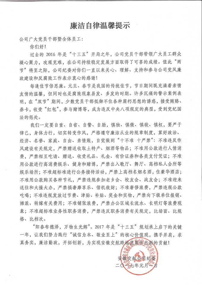 為貫徹落實集團公司紀委《關于做好2017年元旦春節(jié)期間作風督查工作的通知》精神,進一步加強安徽交航公司黨風廉政和作風建設,元旦、春節(jié)前夕,公司紀委分別向分公司負責人、各項目經理發(fā)出了“廉潔自律溫馨提示”信,提醒并要求他們廉潔自律,自覺遵守黨紀國法,嚴格貫徹落實中央“八項規(guī)定”精神和省委“三十條”規(guī)定,持之以恒反對“四風”,做到“廉潔過節(jié),過好廉節(jié)”。