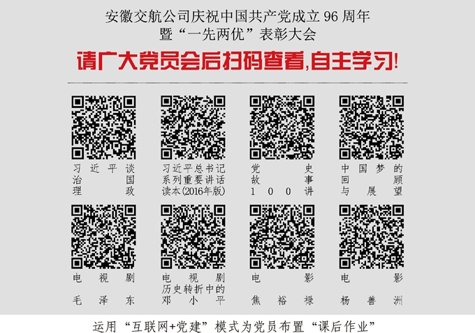會后,公司黨委為全體黨員布置了“課外作業(yè)”,即利用業(yè)余時間掃描二維碼自主學習習近平總書記系列重要講話特別是視察安徽重要講話精神以及黨的光輝歷史和最新時事政治。近年來,隨著“互聯(lián)網(wǎng)+”思維的不斷深化,安徽交航公司黨委有效運用“互聯(lián)網(wǎng)+黨建”模式開展各項工作,積極把“互聯(lián)網(wǎng)+”思維內(nèi)化為創(chuàng)新黨建工作的驅(qū)動力,主動搶占“指尖陣地”,努力打造“口袋黨建”!