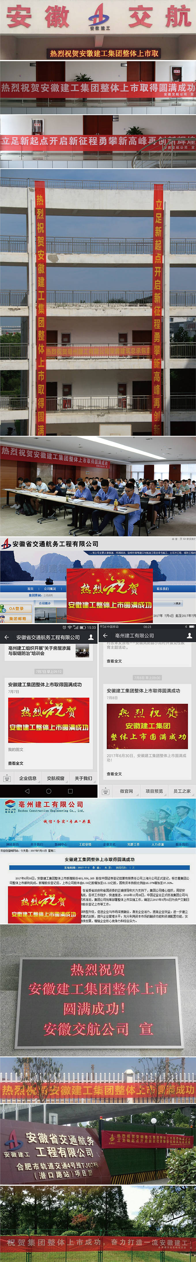 【編者按】2017年6月30日,安徽建工集團(tuán)整體上市新增股份463,554,265股在中國(guó)證券登記結(jié)算有限責(zé)任公司上海分公司正式登記,標(biāo)志著集團(tuán)公司整體上市取得圓滿成功!安徽交航公司黨委根據(jù)集團(tuán)黨委《關(guān)于做好慶祝集團(tuán)公司整體上市成功宣傳工作的通知》精神,積極響應(yīng)、縝密謀劃,全員參與、多策并施,全方位多角度立體化深層次宣傳集團(tuán)公司整體上市成功,成效斐然……