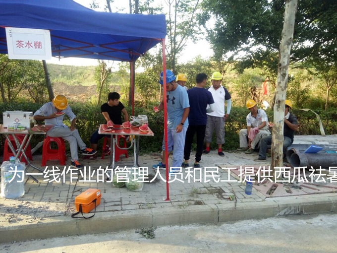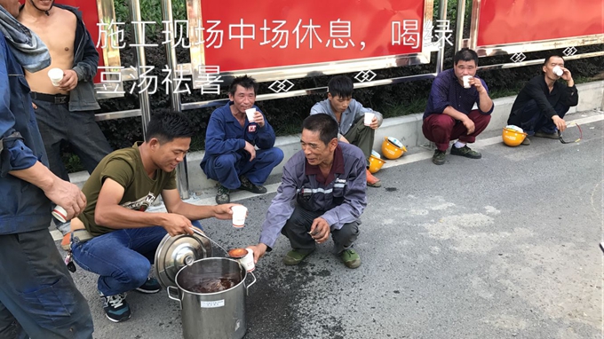 本次送清涼不但為一線作業(yè)人員帶來了水、西瓜和防暑藥品,更設(shè)立了茶棚,每天為一線人員提供綠豆湯和冰水,將關(guān)愛制度化常態(tài)化,讓大家沒有后顧之憂,全心全意奮戰(zhàn)到施工生產(chǎn)中去。