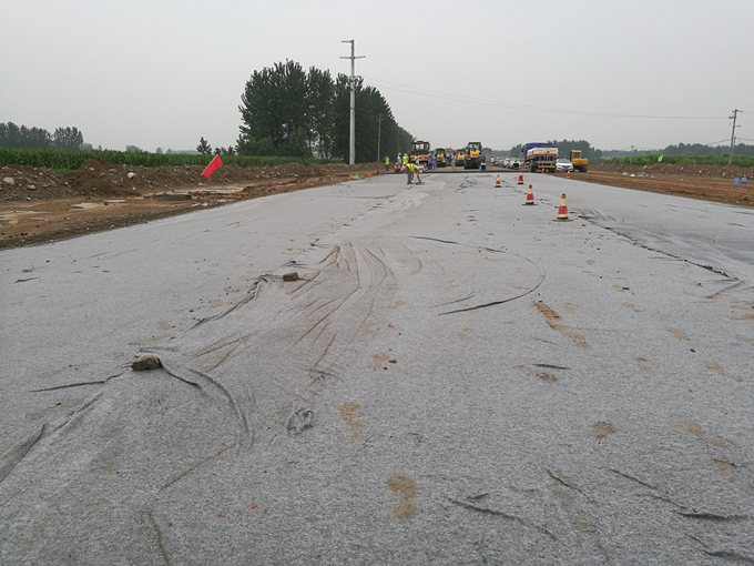在試驗(yàn)段施工結(jié)束后,技術(shù)人員對試鋪路段的各項(xiàng)指標(biāo)進(jìn)行了檢測,均滿足設(shè)計(jì)及規(guī)范要求,檢測數(shù)據(jù)及成果將作為下一步大面積路面施工的指導(dǎo)依據(jù)。水穩(wěn)試驗(yàn)段的順利攤鋪極大鼓舞了員工的士氣,為項(xiàng)目下一步大規(guī)模水穩(wěn)施工奠定了堅(jiān)實(shí)的基礎(chǔ)。
