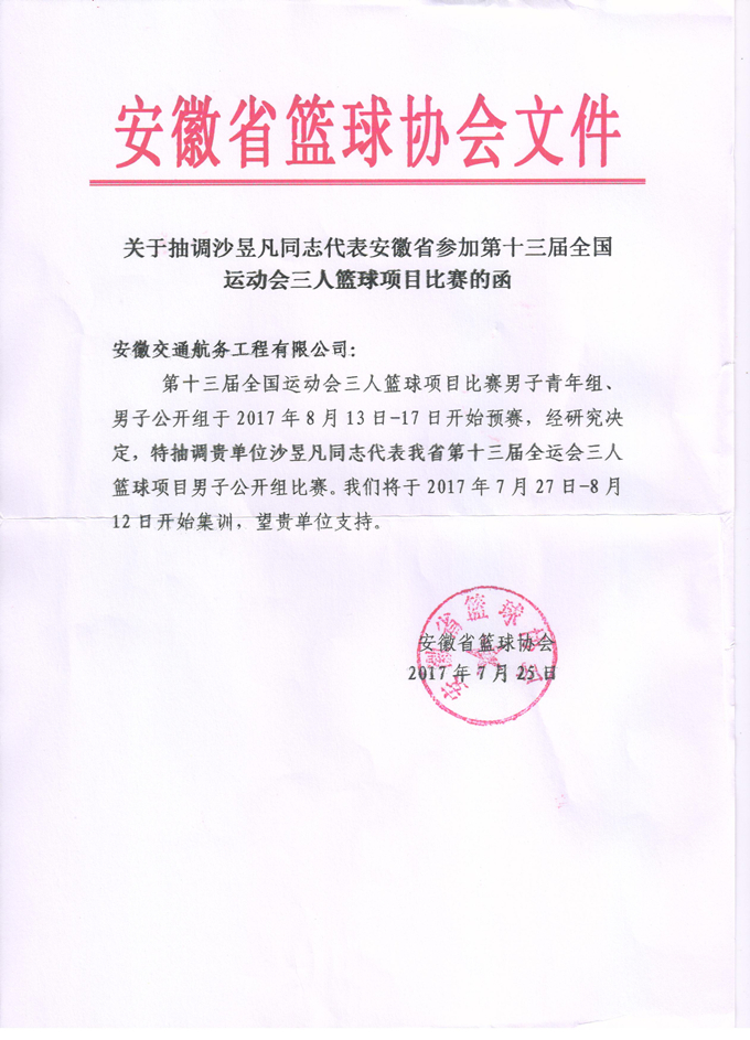 7月25日,安徽省籃球協(xié)會向安徽交航公司發(fā)函,抽調安徽交航員工沙昱凡代表安徽省參加第十三屆全國運動會三人籃球項目比賽。沙昱凡為我公司法務專員,球技精湛,在省內籃球界享有一定知名度。接到此函后,安徽交航領導高度重視,要求公司法務部、人力資源部、工會全力配合省籃協(xié),協(xié)調好運動員的工作,保證充足的集訓和比賽時間,爭取在第十三屆全運會上為我省籃球事業(yè)爭光。