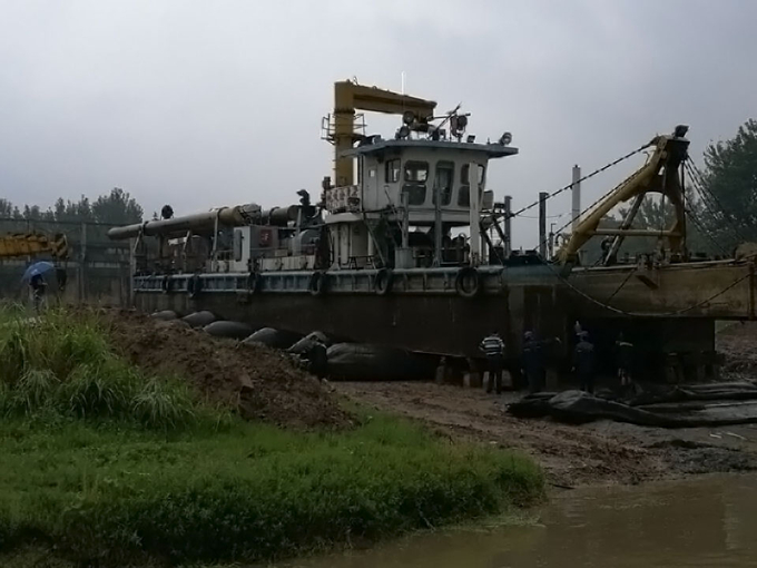 在此期間,我公司“皖吸十一號”等九艘船舶已在鳳臺鑫舶瀚船廠進行修理。由于該船廠沒有承接大噸位挖泥船上坡的經(jīng)驗,在淮河水位較低的情況下他們提出的幾個方案無法落實,而淮河流域附近又沒有更合適的船廠可以完成上坡工作。商經(jīng)理憑著數(shù)十年的工作經(jīng)驗,積極聯(lián)系有資質(zhì)、有經(jīng)驗的外協(xié)人員參與作業(yè)。8月12日商經(jīng)理利用周末休息時間再次冒雨親赴現(xiàn)場指揮,終于使“皖吸11號”順利安全上坡并加以固定。