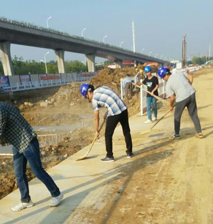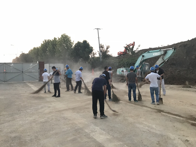 黨員先鋒隊沖鋒在前,青年突擊隊不甘落后。項目部二十多人手拿掃帚肩扛鐵鍬,在項目經(jīng)理帶領(lǐng)下,兩人一組,分段分片,將安全體驗區(qū)、基坑、鋼筋加工廠、重載車道等處全面清掃一遍,部分區(qū)域灑水車配合水槍洗刷干凈。清理工作從下午四點持續(xù)到晚上七點,雖然大家汗流浹背,雖然大家滿身灰塵,但看著煥然一新的現(xiàn)場,心中只有自豪和欣慰。