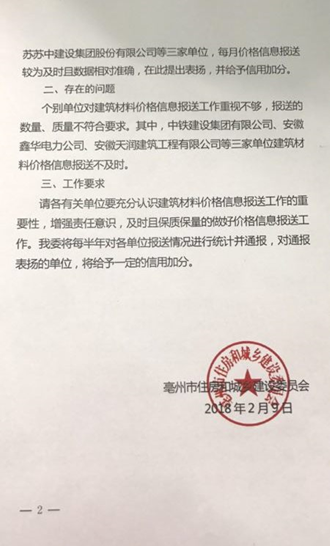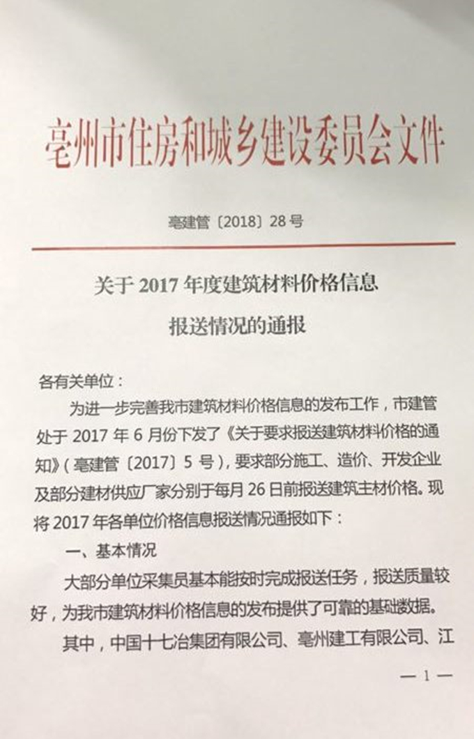 2018年2月9日,亳州市住房和城鄉(xiāng)建設委員會下發(fā)了《關于2017年度建筑材料價格信息報送情況的通報》(亳建管〔2018〕28號),文件中對亳州建工在2017年度建筑材料價格信息報送工作中積極主動配合、每月按時報送建筑材料價格且數(shù)據(jù)準確的做法表示肯定,并提出表揚,給予信用加分的獎勵。