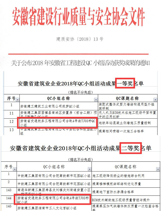 近日,在合肥舉行的2018年度安徽省工程建設(shè)QC小組活動(dòng)交流會(huì)上,軌道項(xiàng)目部?jī)蓚€(gè)課題《地鐵車站混凝土側(cè)墻施工質(zhì)量控制》、《BIM技術(shù)輔助施工現(xiàn)場(chǎng)質(zhì)量管控與提升》分別榮獲QC成果一、二等獎(jiǎng)。