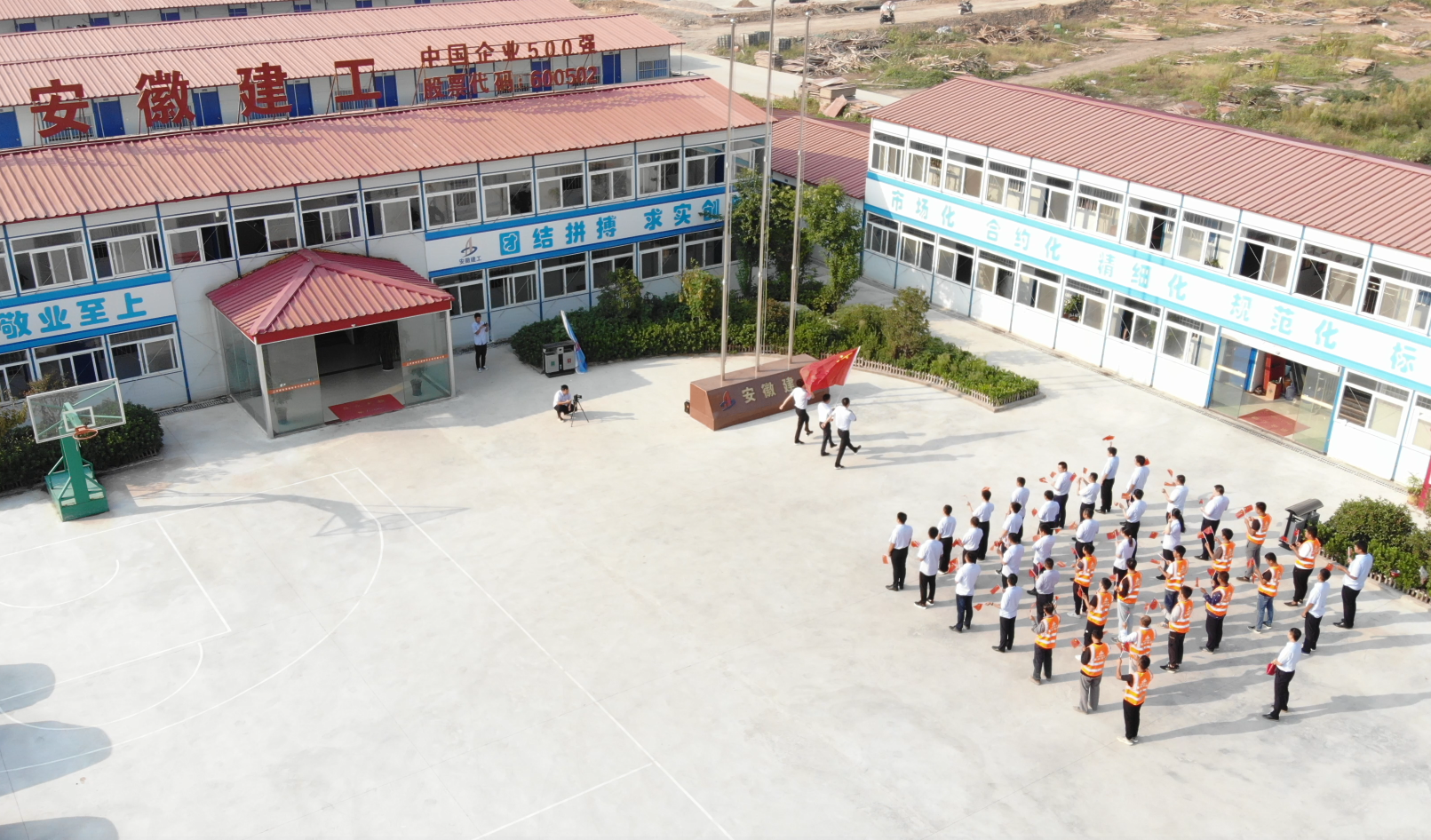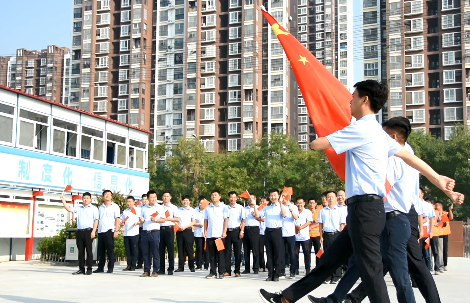 上午8時許,在項目及班組人員的注目禮下,英姿颯爽的護(hù)衛(wèi)隊護(hù)送鮮艷的五星紅旗進(jìn)場。行禮完畢,伴隨著莊嚴(yán)的中華人民共和國國歌,五星紅旗冉冉升起,迎風(fēng)飄揚。全體人員深懷著對祖國無限的熱愛和崇高的敬意,向國旗行注目禮。