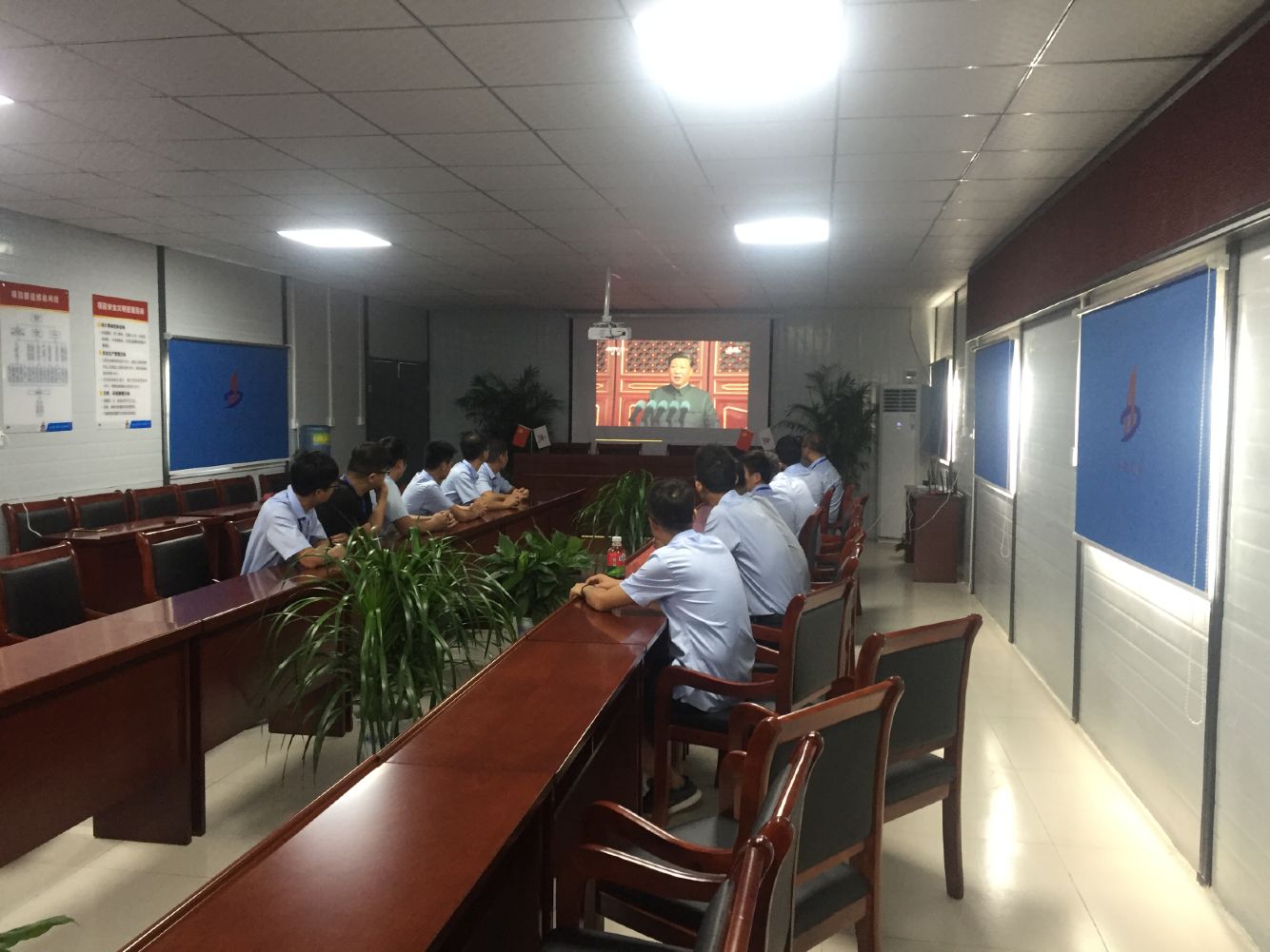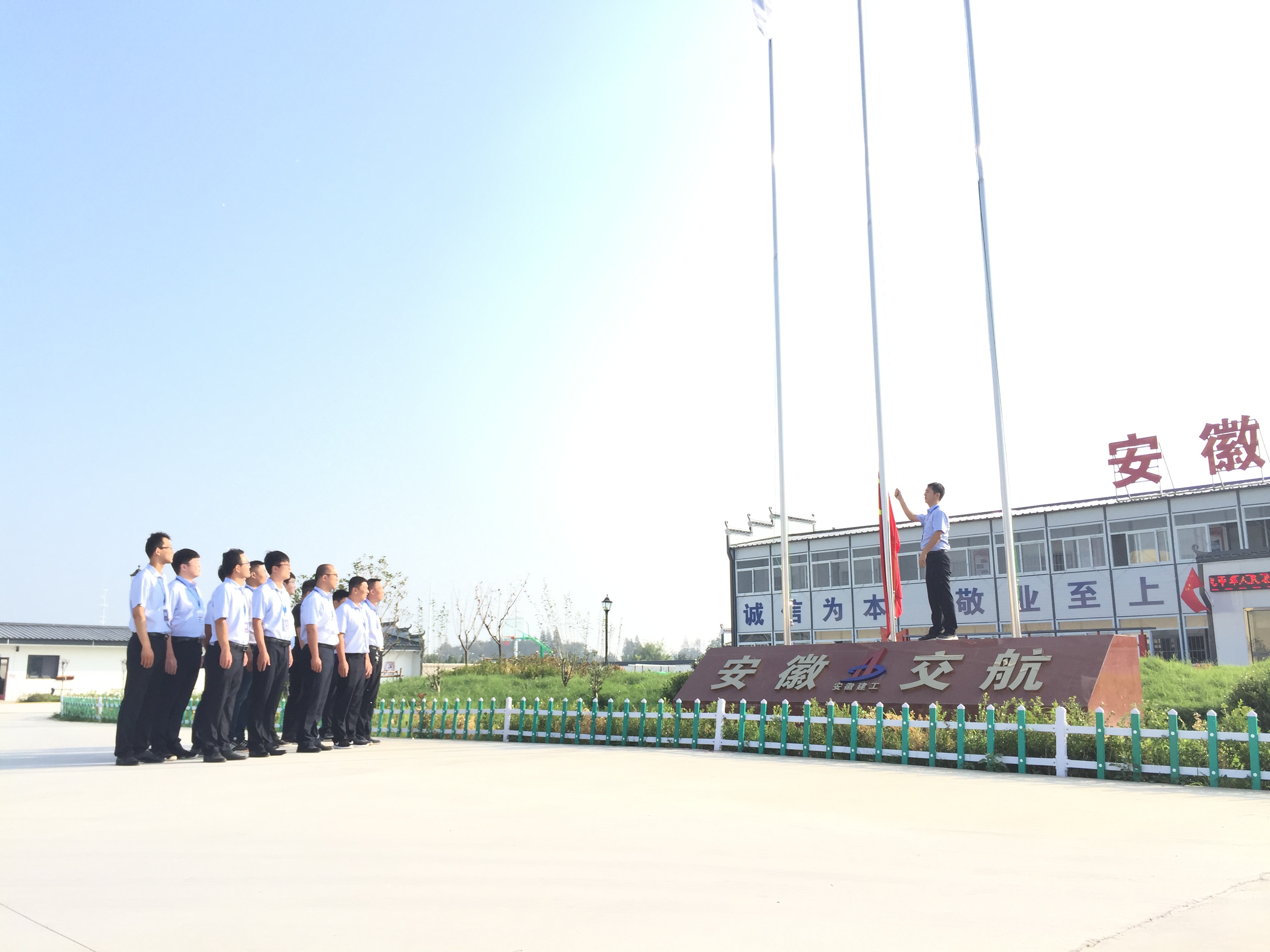 早上九點(diǎn),項(xiàng)目部全體員工在廣場(chǎng)升國(guó)旗,伴隨著莊嚴(yán)的《中華人民共和國(guó)國(guó)歌》,五星紅旗冉冉升起,迎風(fēng)飄揚(yáng)。在場(chǎng)的每一個(gè)人向國(guó)旗行注目禮,深懷對(duì)祖國(guó)無限的熱愛和崇高的敬意。隨后,大家來到項(xiàng)目會(huì)議室組織觀看了新中國(guó)成立70周年大閱兵。