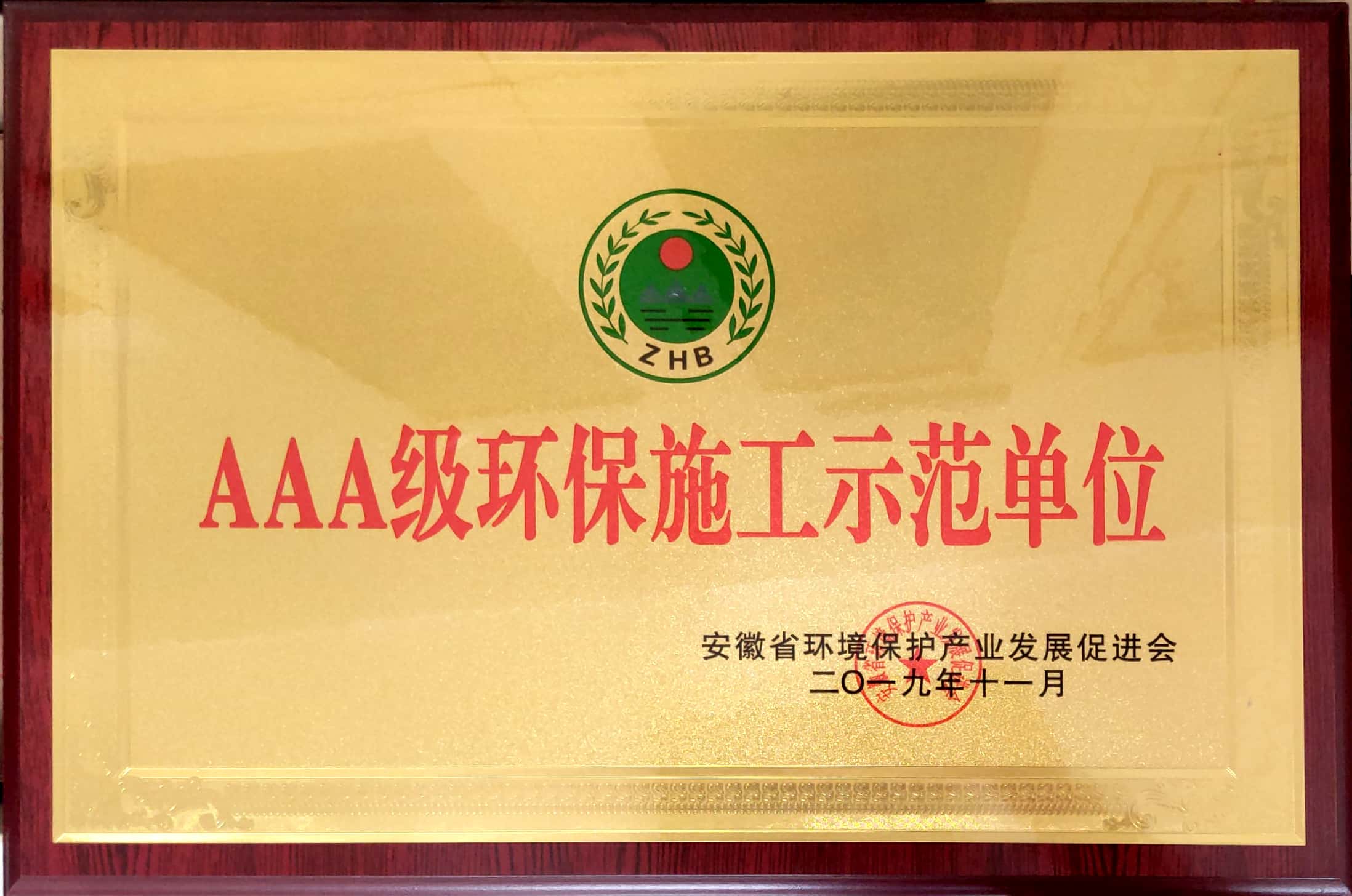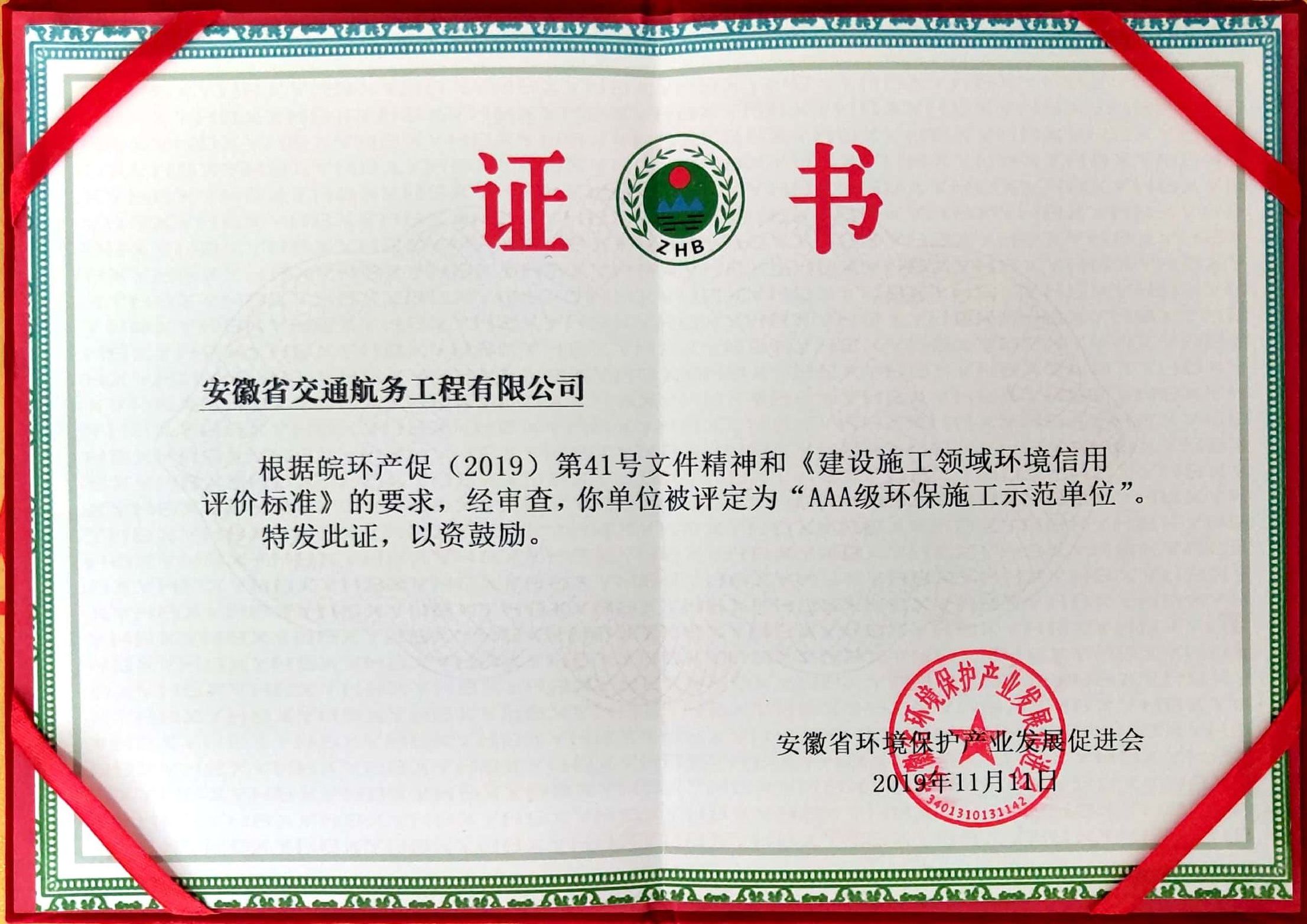 近日,安徽交航公司被安徽省環(huán)境保護(hù)產(chǎn)業(yè)發(fā)展促進(jìn)會(huì)評(píng)為“AAA級(jí)環(huán)保施工示范單位”。