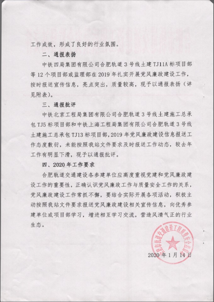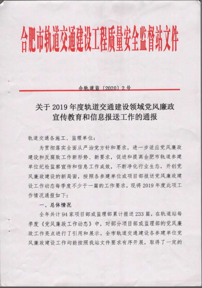 近日,市城鄉(xiāng)建設(shè)局軌道站印發(fā)《關(guān)于2019年度軌道交通建設(shè)領(lǐng)域黨風(fēng)廉政宣傳教育和信息報(bào)送工作的通報(bào)》,合肥軌道交通4號(hào)線TJ03標(biāo)項(xiàng)目部在黨建工作中表現(xiàn)突出,受到通報(bào)表揚(yáng),這是該項(xiàng)目部黨建工作連續(xù)第三年獲得行政主管部門的通報(bào)表揚(yáng)。