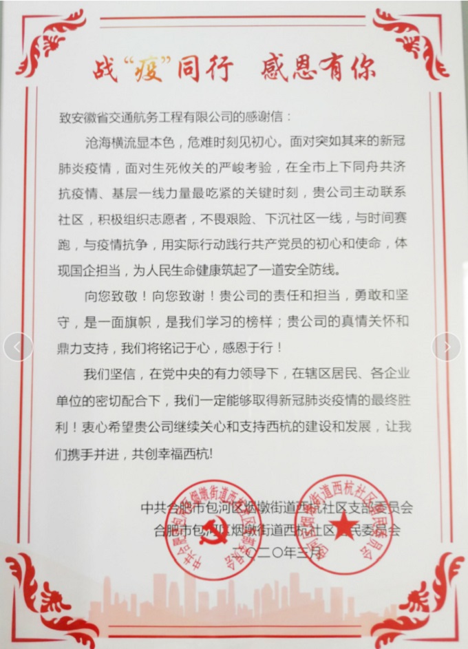 3月27日,包河區(qū)煙墩街道西杭社區(qū)為安徽交航公司送來(lái)一封感謝信。感謝信寫到:滄海橫流顯本色,危難時(shí)刻見(jiàn)初心。面對(duì)突如其來(lái)的新冠肺炎疫情,面對(duì)生死攸關(guān)的嚴(yán)峻考驗(yàn),在全市上下同舟共濟(jì)抗疫情、基層一線力量最吃緊的關(guān)鍵時(shí)刻,貴公司主動(dòng)聯(lián)系社區(qū),積極組織志愿者,不畏艱險(xiǎn)、下沉社區(qū)一線,與時(shí)間賽跑,與疫情抗?fàn)?,用?shí)際行動(dòng)踐行共產(chǎn)黨員的初心和使命,體現(xiàn)國(guó)企擔(dān)當(dāng),為人民生命健康筑起了一道安全防線。