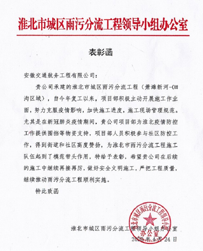 日前,淮北市城區(qū)雨污分流工程領(lǐng)導(dǎo)小組辦公室發(fā)來表彰函,對安徽交航公司在淮北雨污分流工程項目中積極推進(jìn)復(fù)工復(fù)產(chǎn)及疫情防控工作給予了高度贊揚(yáng),并希望安徽交航公司在后續(xù)施工中再接再厲,做好安全文明施工,嚴(yán)把工程質(zhì)量,繼續(xù)推動雨污分流工程順利實施。