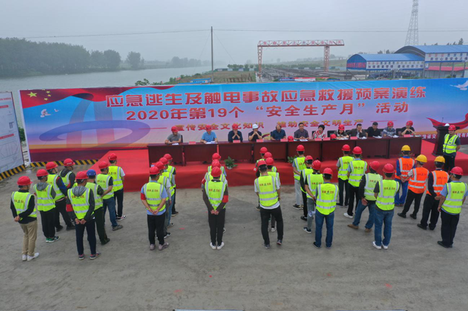 針對工地有可能發(fā)生的安全事故,此次安全演練共有應(yīng)急逃生急救與觸電急救兩方面內(nèi)容,演練的主要內(nèi)容有圍堰基坑涌水逃生,以及觸電、傷員急救。項目部從方案制定、人員安排、器材準(zhǔn)備、現(xiàn)場管理等方面出發(fā),項目部以及各施工班組均派遣管理人員和工人參與演練,并邀請利辛縣交通局、海事局、水利局、項目公司、監(jiān)理單位前來觀摩。此次應(yīng)急演練取得圓滿成功,得到現(xiàn)場觀摩單位的一致好評。