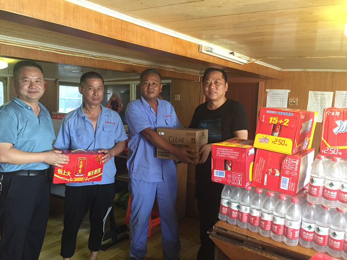 防汛搶險工作尚未結束,三伏天的驕陽炙烤著大地,工程船開啟了“鐵板燒”模式。8月6日,公司黨委委員、總經(jīng)理助理董雙武一行冒著高溫酷暑來到皖蛟龍?zhí)柎牐?/FONT>親切看望慰問堅守一線的船員們,并為他們帶來了飲料、毛巾以及藿香正氣水等防暑降溫物品。
