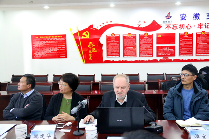 聽完介紹后,施密特先生對其在生物科技方面的研究進行了講解,并從微觀角度對分子結(jié)構(gòu)、水分子電離結(jié)合、細菌的工作原理等方面,介紹了利用微生物如何對污水中的雜質(zhì)進行分解和處理達到標(biāo)準(zhǔn)的方法。座談中,董傳明對中德合作新型污水處理技術(shù)依托的安徽水利-GSA城市生活廢水處理工藝進行了介紹,并與參會人員就工程技術(shù)研究及水環(huán)境治理等方面進行了詳細討論。