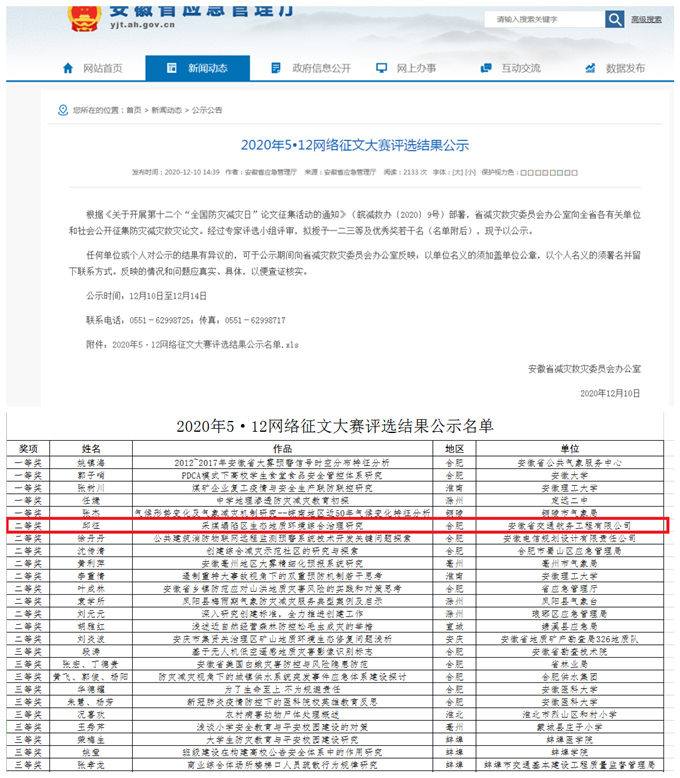 近日,從安徽省應(yīng)急管理廳網(wǎng)站獲悉,全省防災(zāi)減災(zāi)救災(zāi)論文評(píng)選結(jié)果正式揭曉,安徽交航公司報(bào)送的《采煤塌陷區(qū)生態(tài)地質(zhì)環(huán)境綜合治理研究》論文喜獲二等獎(jiǎng)。