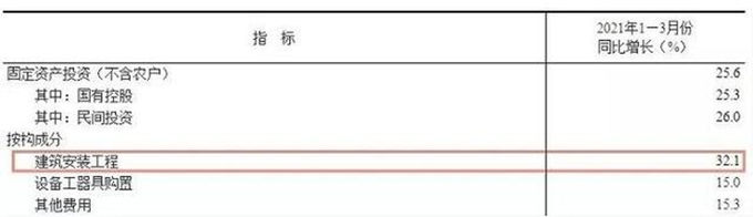 由上圖可見,2021年1-3月份,建筑安裝工程投資同比增長(zhǎng)32.1%。