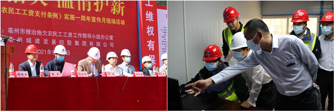 活動(dòng)結(jié)束后,亳州建工總經(jīng)理劉軍陪同市人社局局長(zhǎng)陳長(zhǎng)安對(duì)東方名府云著項(xiàng)目的日常勞資工作進(jìn)行了檢查指導(dǎo),并督促新系統(tǒng)盡快落實(shí)。