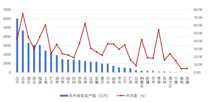 從外向度(即本地區(qū)在外省完成的產(chǎn)值占本地區(qū)建筑業(yè)總產(chǎn)值的比例)來(lái)看,排在前三位的地區(qū)是北京、天津和上海,分別為74.76%、62.56%、60.44%。此外,外向度超過30%的還有青海、福建、湖北、江蘇、內(nèi)蒙古、陜西、河北、山西、湖南、遼寧、江西、福建、廣東等13個(gè)地區(qū)(圖4)。