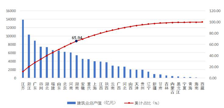 除江蘇、浙江外,總產(chǎn)值超過5000億元的還有廣東、四川、湖北、福建、山東、北京、河南、湖南8個(gè)地區(qū),上述10省市完成的建筑業(yè)總產(chǎn)值占全國(guó)建筑業(yè)總產(chǎn)值的65.94%(圖1)。