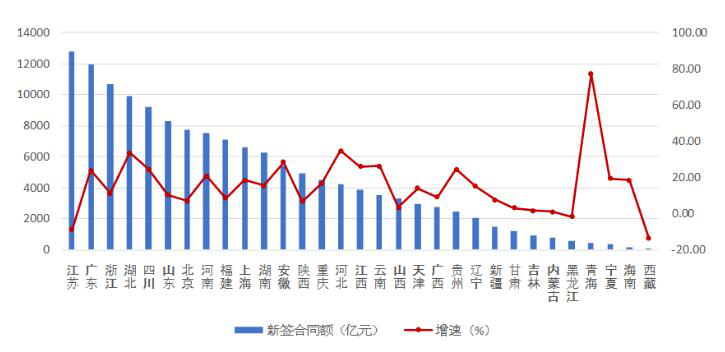 簽合同額均超過10000億元,分別為12763.52億元、11925.7億元、10702.53億元。此外,新簽合同額超過6000億元的還有湖北、四川、山東、北京、河南、福建、上海、湖南等8個(gè)地區(qū)(圖3)。新簽合同額同比增長(zhǎng)最快的是青海,達(dá)到77.15%。此外,河北、湖北、安徽、云南、江西、四川、貴州、廣東、河南等9個(gè)地區(qū)的增幅均超過20%。西藏、江蘇、黑龍江3個(gè)地區(qū)新簽合同額出現(xiàn)負(fù)增長(zhǎng),其中西藏的負(fù)增長(zhǎng)超過了10%。