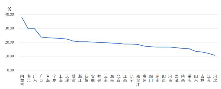 從各地區(qū)建筑業(yè)總產(chǎn)值增長(zhǎng)情況看,所有地區(qū)的建筑業(yè)總產(chǎn)值較上年同期都有不同幅度的增長(zhǎng)。其中,內(nèi)蒙古的增幅最大,達(dá)到了37.93%。此外,湖北、廣東、廣西、青海、寧夏、上海、天津、甘肅、浙江、新疆、安徽等11個(gè)地區(qū)的增幅均超過20%(圖2)。