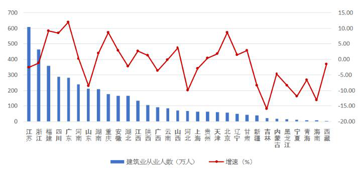 2021年上半年,全國(guó)建筑業(yè)從業(yè)人數(shù)超過百萬(wàn)的地區(qū)共13個(gè)。江蘇、浙江依然是從業(yè)人數(shù)大省,人數(shù)分別為608.55萬(wàn)人和464.95萬(wàn)人。此外,福建、四川、廣東、河南、山東、湖南等6地區(qū)從業(yè)人數(shù)均超過200萬(wàn)人。
