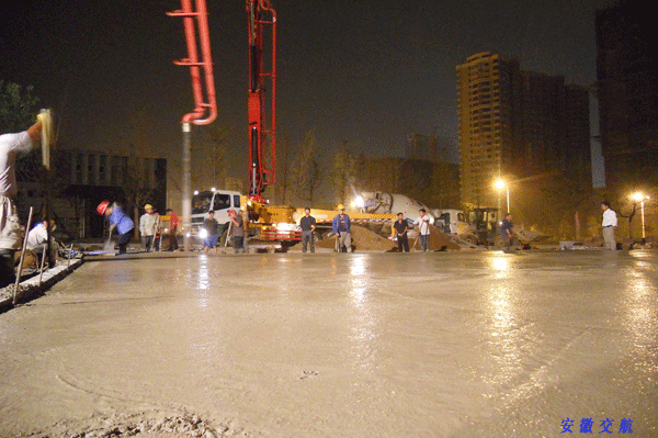 零晨3:40,細雨綿綿,隨著砼泵車的最后一聲鳴響,滁州市政務(wù)中心廣場第二階段四館廣場40000m2鋼筋砼基礎(chǔ)施工全部結(jié)束,因受四館土建施工影響,砼工作面交付緩慢,花崗巖鋪裝受阻,最后一塊砼工作面于本月18日交出,我方隨即展開搶工,10個日夜完成20000m3土方挖運、2000m管道鋪設(shè)、1500m3級配碎石攤鋪、5000m2鋼筋砼澆筑。這也宣布了四館廣場進入了全面鋪裝階段,力爭在10月15日前完成剩余約10000m2的花崗巖鋪裝任務(wù),為交航爭光,向農(nóng)歌會獻禮!