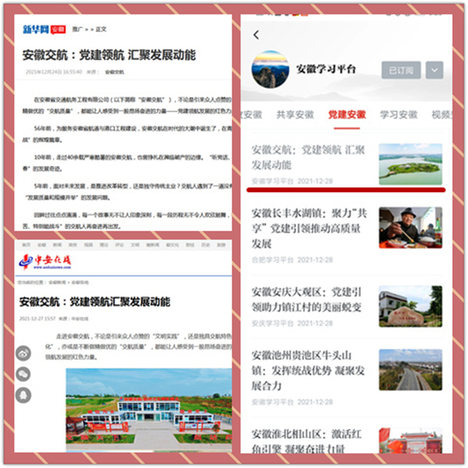 近日,新華社(新華網(wǎng))、學(xué)習(xí)強(qiáng)國、中安在線等中央及省級(jí)主流媒體,紛紛聚焦安徽交航黨建工作,集中報(bào)道了十九大以來安徽交航深入學(xué)習(xí)貫徹習(xí)近平新時(shí)代中國特色社會(huì)主義思想,堅(jiān)持和加強(qiáng)黨的領(lǐng)導(dǎo),推進(jìn)全面從嚴(yán)治黨及以黨建領(lǐng)航高質(zhì)量發(fā)展等方面取得的一系列成果。