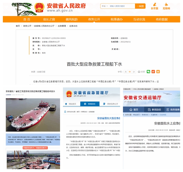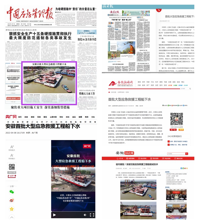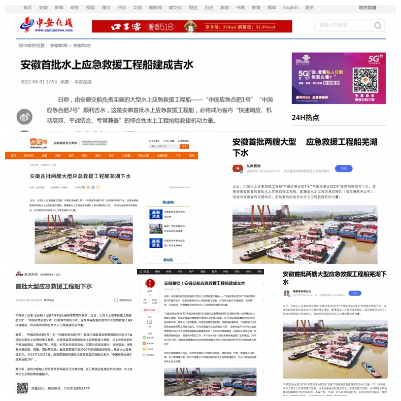 日前,由安徽交航負(fù)責(zé)實(shí)施的省內(nèi)首批大型水上應(yīng)急救援工程船——“中國應(yīng)急合肥1號”“中國應(yīng)急合肥2號”順利建成吉水,這一重要消息通過安徽省國資委、中安在線發(fā)布后,立即引發(fā)社會廣泛關(guān)注,獲中國應(yīng)急報(bào)、央廣網(wǎng)、安徽日報(bào)、安徽商報(bào)、瀟湘晨報(bào)等主流媒體以及安徽國企網(wǎng)、安徽新聞網(wǎng)、九派新聞、騰訊網(wǎng)、新浪網(wǎng)以及搜狐網(wǎng)等多家國內(nèi)知名新聞網(wǎng)站集中報(bào)道,其中安徽省人民政府、安徽省交通運(yùn)輸廳、安徽省應(yīng)急管理廳等政府網(wǎng)站紛紛進(jìn)行了轉(zhuǎn)載。
