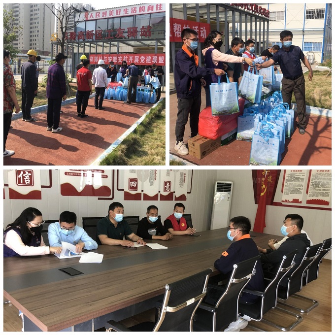 活動中,雙方就黨建聯(lián)盟活動后期工作開展進行了深入交流,并表示將充分利用黨建工作共建平臺,共同探索基層黨建的新思路、新舉措,實現(xiàn)黨建聯(lián)盟共促發(fā)展的目標。隨后,滁州項目黨支部聯(lián)合鄭郢社區(qū)黨支部為項目一線工人們送去了毛巾、香皂、礦泉水等慰問品,為在高溫酷暑下仍奮戰(zhàn)在項目一線的工人們送上溫情關(guān)懷。