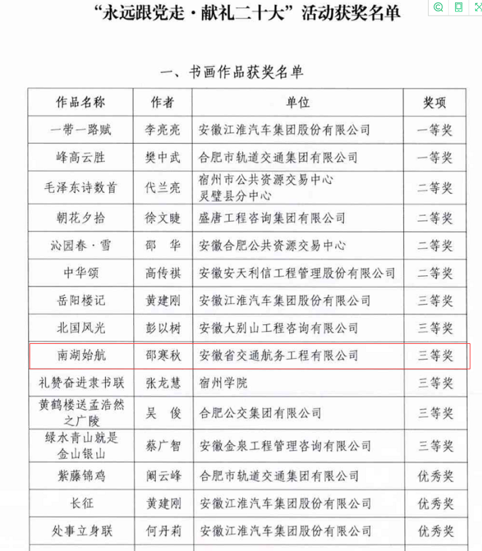 日前,由安徽省招標(biāo)采購(gòu)協(xié)會(huì)主辦的“永遠(yuǎn)跟黨走·獻(xiàn)禮二十大”作品征集評(píng)選活動(dòng)獲獎(jiǎng)作品名單揭曉!經(jīng)過(guò)激烈競(jìng)爭(zhēng),安徽交航公司《南湖始航》書(shū)法作品榮獲書(shū)畫(huà)類作品三等獎(jiǎng)。