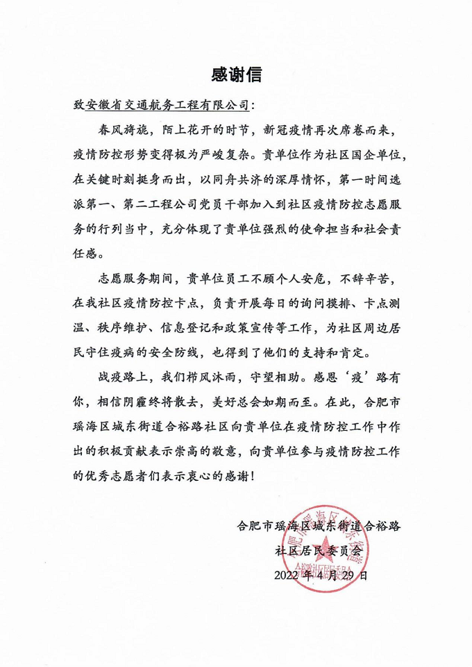 “第一時間選派第一、第二工程公司黨員干部加入到社區(qū)疫情防控志愿服務(wù)的行列當(dāng)中,充分體現(xiàn)了貴單位強烈的使命擔(dān)當(dāng)和社會責(zé)任感?!?月29日,公司收到了一封來自合肥市瑤海區(qū)城東街道合裕路社區(qū)的感謝信,信中對公司積極參與社區(qū)疫情防控工作表示由衷感謝。
