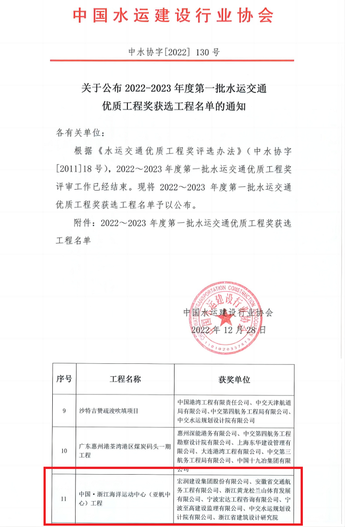 12月28日,由安徽交航和宏潤建設聯(lián)合體承建的中國·浙江海洋運動中心(亞帆中心)工程榮獲“全國水運交通優(yōu)質工程獎”,該獎項由中國水運建設行業(yè)協(xié)會頒布。