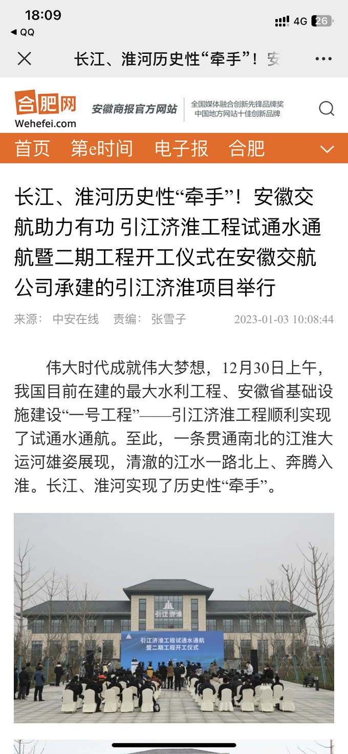 1月3日,安徽商報發(fā)布報道引江濟(jì)淮工程試通水通航暨二期工程開工儀式在安徽交航公司承建的引江濟(jì)淮項目舉行。