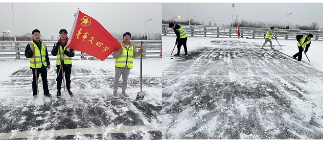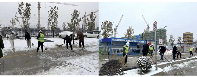 第四工程公司組織青年團(tuán)員清掃項(xiàng)目部、道路兩旁積雪。