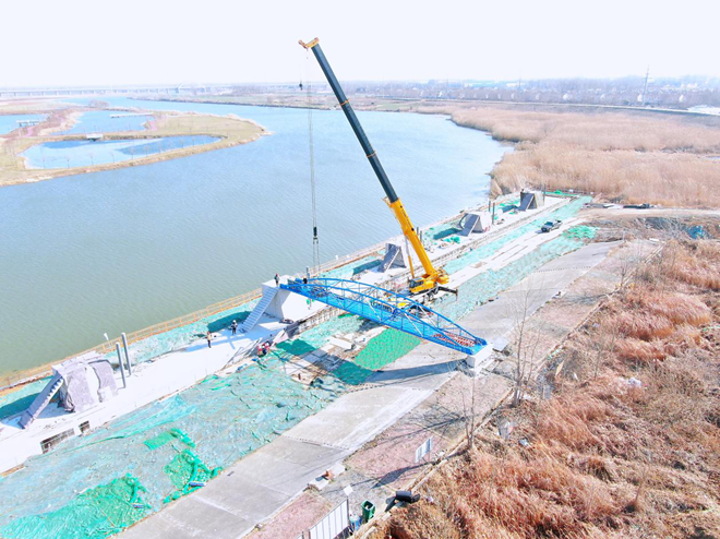 12月21日,沱澮河航道蚌埠段整治工程施工02標(biāo)項(xiàng)目固鎮(zhèn)閘下錨地順利完成了鋼引橋吊裝施工,標(biāo)志著該單位工程主體建設(shè)全部完成,全面進(jìn)入收尾階段。