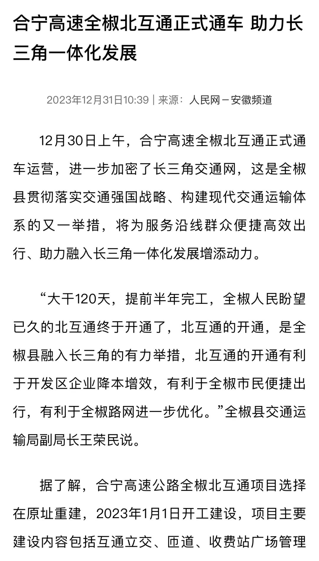 人民網(wǎng)安徽頻道以《合寧高速全椒北互通正式通車(chē) 助力長(zhǎng)三角一體化發(fā)展》為題,報(bào)道合寧高速公路全椒北互通項(xiàng)目通車(chē)儀式的舉行。