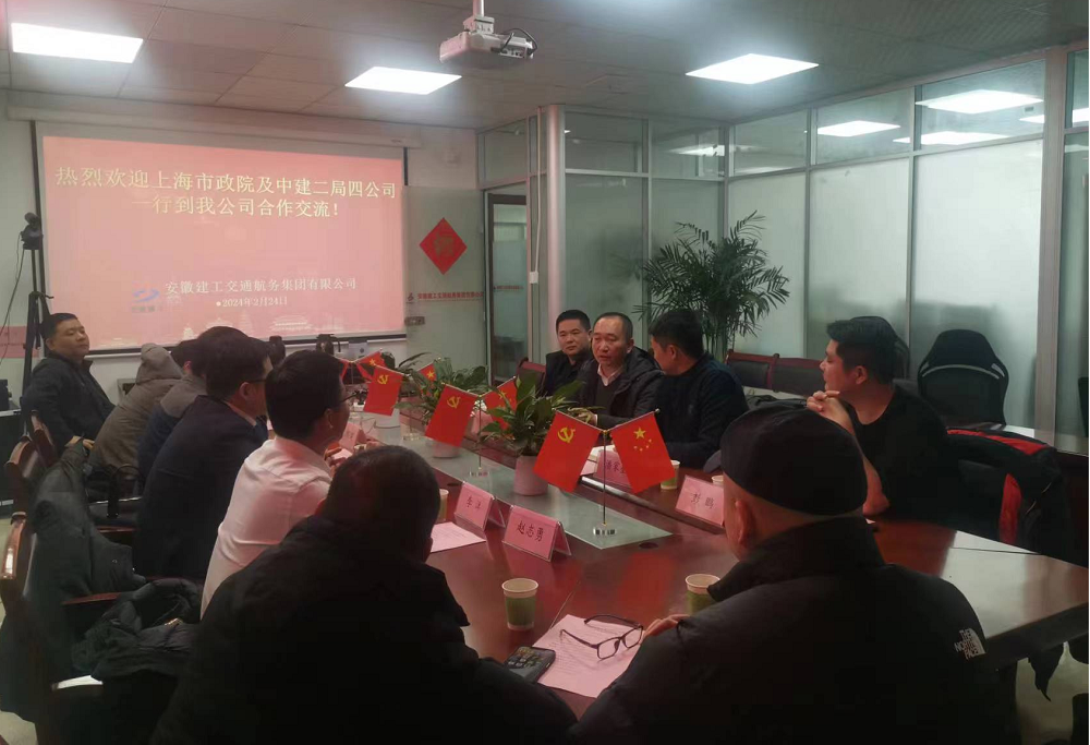 2月24日上午,上海市政工程設(shè)計(jì)研究總院(集團(tuán))有限公司副院長陳建、中建二局四公司安徽分公司總經(jīng)理董震震一行赴公司商談項(xiàng)目合作。建工交航副總經(jīng)理邢磊熱情接待并召開商談會(huì)。