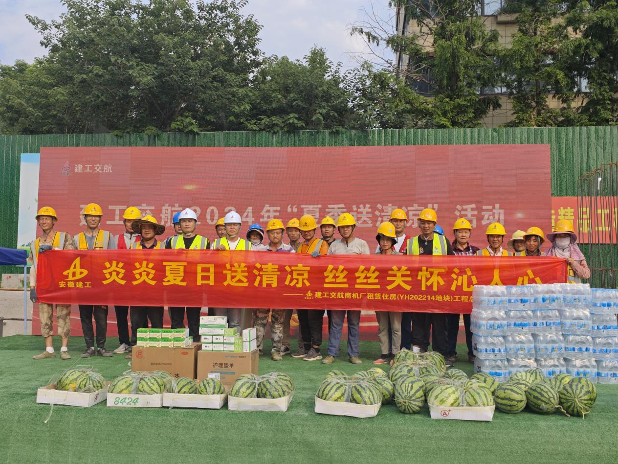 項目部管理人員共同為一線工人們送上了藿香正氣水、十滴水、西瓜、清涼飲品等防暑藥品和清涼物資,叮囑大家注意防暑,保障自身的安全健康。