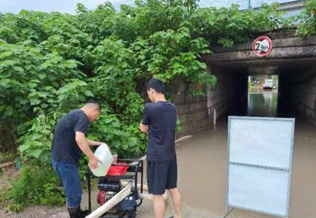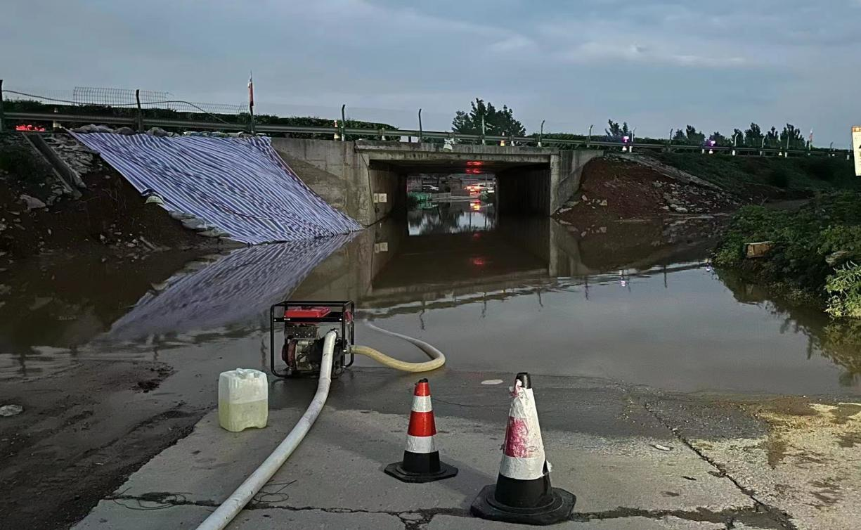連霍高速下穿路段由于地勢較低,積水嚴重,已對過往車輛通行造成嚴重影響。面對這一緊急情況,項目部迅速響應(yīng),對遇險路段進行封堵,組織人員安裝水泵,鋪設(shè)水管,爭分奪秒進行排水工作,并安排專人進行24小時值班,項目班子成員帶頭沖鋒,充分發(fā)揮“兩個模范”作用,為當(dāng)?shù)卮迕竦陌踩鲂斜q{護航。