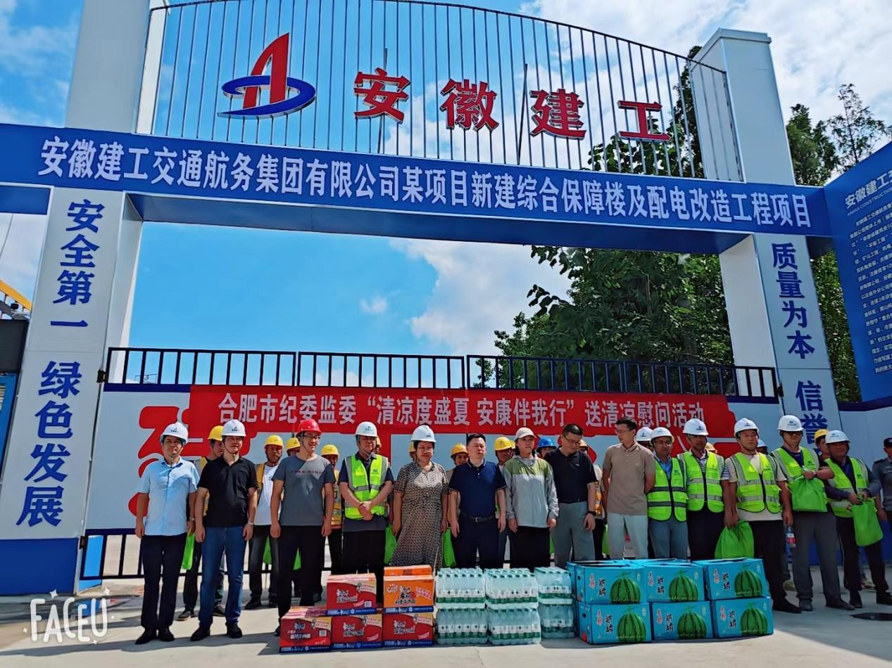 7月25日下午,合肥市紀委常委、秘書長、監(jiān)委委員韋晉峰,市紀委監(jiān)委機關(guān)黨委專職副書記張雷,市黨風廉政教育基地主任龐德萍一行深入建工交航城建分公司位于瑤海區(qū)的項目開展“清涼度盛夏 安康伴我行”送清涼活動,為堅守一線的職工送上防暑降溫物品。