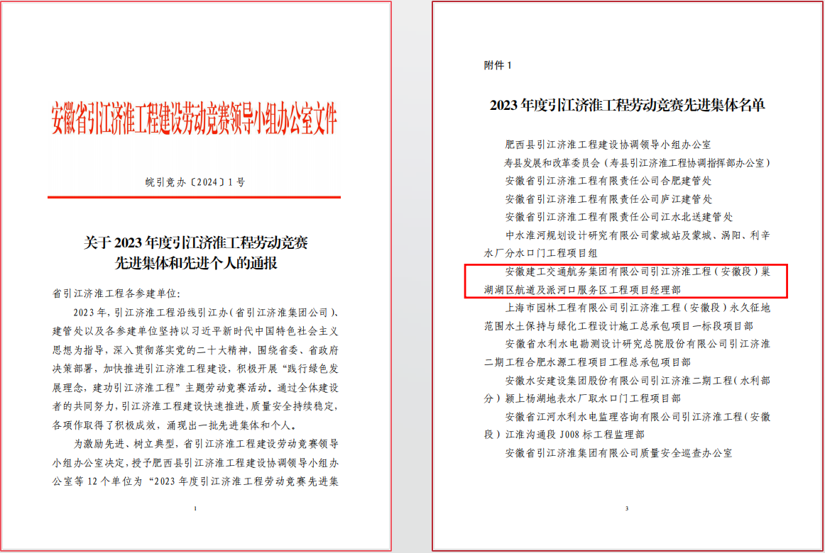 近日,水建分公司引江濟(jì)淮工程(安徽段)巢湖湖區(qū)航道及派河口服務(wù)區(qū)工程項(xiàng)目經(jīng)理部榮獲2023年度引江濟(jì)淮工程先進(jìn)集體。